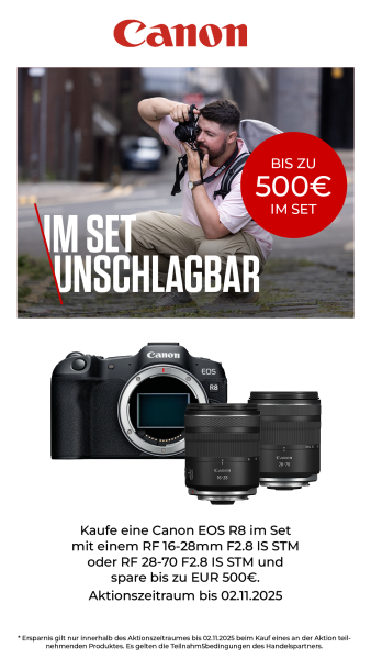 Die Canon Bundleaktion – kaufe bis zum 02.11.2025 ein Canon R8 + Objektiv RF 2,8/28-70 mm und spare 400 €*.