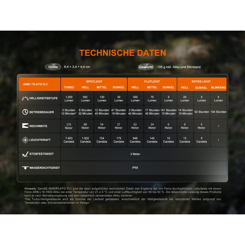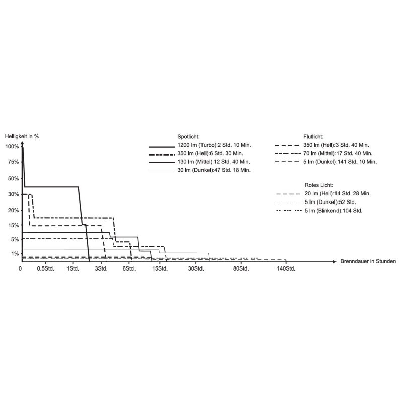 Hinweis: Die zuvor genannten Werte wurden im Fenix Labor bei 21±3°C und 50% - 80% Luftfeuchtigkeit unter Verwendung des Fenix ARB-L18-1600 Akku ermittelt. Je nach Umgebung, Alter, verwendetem Akku und Akkunutzung können die Werte abweichen.* : Die Brenndauer in “Turbo” ist inkl. der verminderten Helligkeit aufgrund der eingebauten Temperatursicherung gemessen. Lieferumfang: