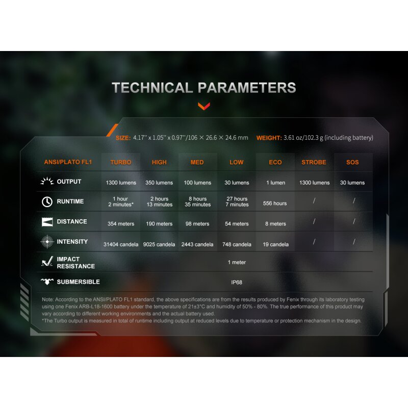 Fenix ARB-L18-1600-Akku bei einer Temperatur von 21 ± 3 °C und einer Luftfeuchtigkeit von 50 bis 80 %. Die tatsächliche Leistung dieses Produkts kann je nach Betriebsumgebung und dem tatsächlich verwendeten Akku variieren.
