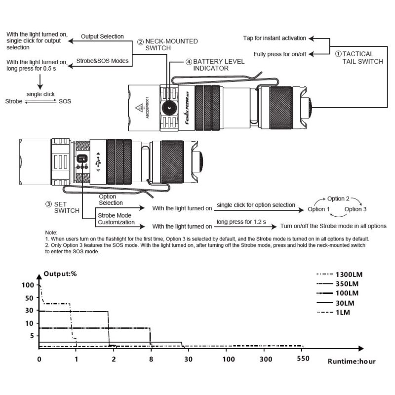 *Die Turbo-Helligkeitsstufe wird als Summe der Laufzeit gemessen, einschließlich der Helligkeitsstufe bei reduzierten Werten aufgrund von Temperatur oder Schutzmechanismen im Design. Der SET-Modus ist mit drei Beleuchtungsoptionen ausgestattet, die je nach Lichtanforderung ausgewählt werden können.