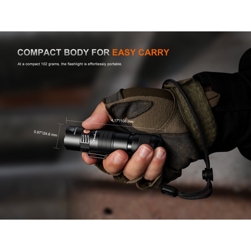 Die Fenix PD26R ACE ist eine kompakte Taschenlampe, mit einer Lichtleistung von max. 1.300 Lumen und einer beeindruckenden Leuchtweite von bis zu 354 Metern eine außergewöhnliche Leistung bietet. Immer einsatzbereit – dank des versteckten USB-Typ-C-Anschlusses und des mitgelieferten 1600-mAh-Akkus ist Ihre Taschenlampe jederzeit einsatzbereit Mit dem innovativen Set Modus kann einfach und unkompliziert die Gesamtanzahl der Leuchtstufen + Strobe eingestellt werden. So ist die PD26R ACE schnell auf die jeweilige Nutzung anpassbar. Der taktische Endschalter, der versteckte SET-Schalter und der seitliche Schalter ermöglichen die sofortige Aktivierung, die Auswahl von Optionen und andere Funktionen und sorgen so für eine effiziente und einfache Bedienung. Der Zwei-Wege-Clip und das kompakte Design sorgen für eine sichere Befestigung und einfachen Transport und machen sie zu einem unverzichtbaren Werkzeug für Wanderer und taktische Anwender. Die Daten: