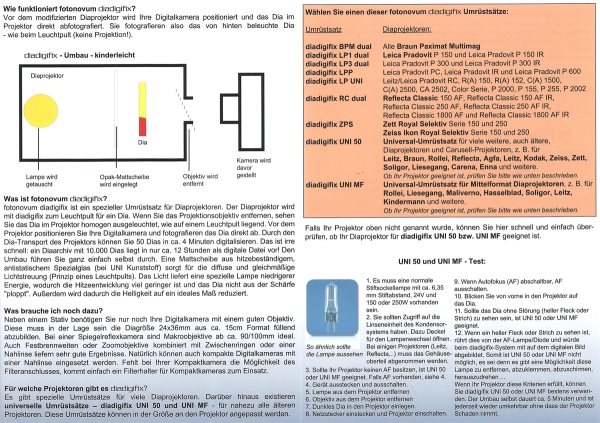 Mattscheiben aus hitzebeständigem, mattiertem Spezial-Kunststoff sorgen für die diffuse und gleichmäßige Lichtstreuung (Prinzip eines Leuchtpults). Das Licht liefert eine Speziallampe, wodurch die Hitzeentwicklung viel geringer ist und somit das Dia nicht aus der Schärfe 'ploppt'. Für die Kamera-Justage und die Weiterverarbeitung mit der Software werden Einstelldia und eine Anleitung mitgeliefert.