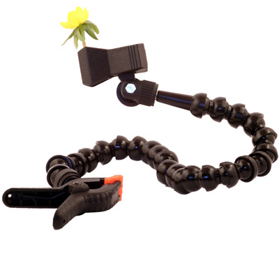 Die Dritte Hand bei Makrofotos im Gelände ist ein flexibler Arm (27 mm Durchmesser) mit Stativklemme (für Stativbein oder Ast, etc. bis 4 cm) und Multi-Fix-Klemme (für Aufheller, Diffusor, Pflanze, etc).