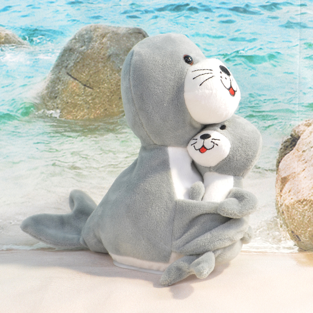 Der wackelnde Laber-Seehund Sally, welches sein Baby Malte im Arm hält, nimmt fast alles auf (maximal 6 Sekunden) und gibt es mit einer witzigen Stimme wieder.