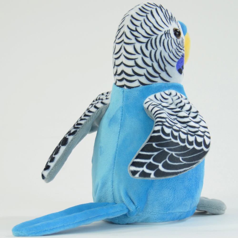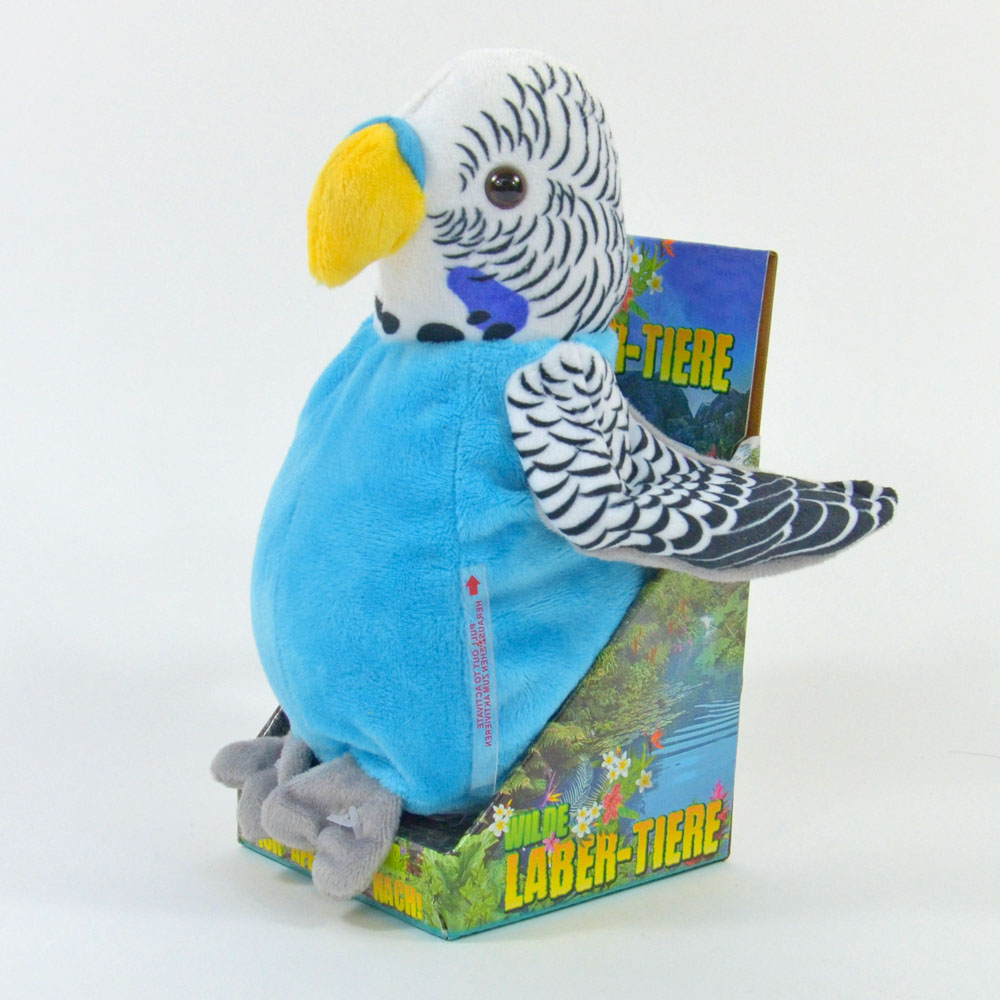 Plüschfigur, ca. 17x21x11cm. Der Laber-Sittich nimmt fast alles auf (maximal 6 Sekunden) und gibt es mit einer witzigen Stimme wieder, dabei bewegt sich der Kopf hin und her.