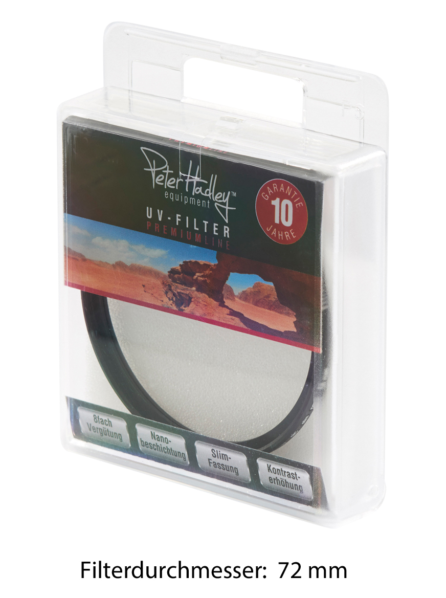 Ø 72 mm, MC 8fach Vergütung (4 Schichten pro Seite), Slim Fassung von 2,9 mm, UV 390 hochwertigstes Glas, Nano-Beschichtung für Abperl-Effekt, Premiumline für höchste Qualität