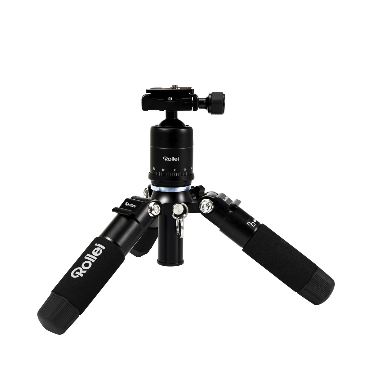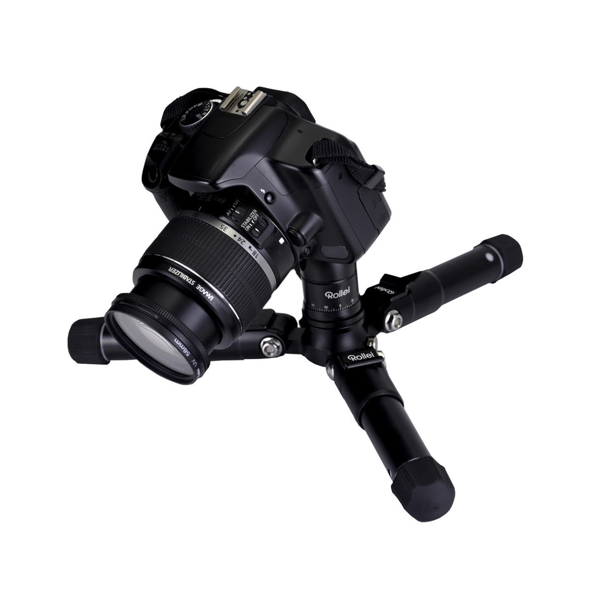 Mit dem Mini-Stativ Compact Traveler Mini M-1 (ehemals M5-Mini) vereinen Sie die Vorteile eines Reisestativs mit der Tragkraft eines ausgewachsenen Dreibeins. Aus leichtem Aluminium gefertigt, wiegt das Compact Traveler Mini M-1 gerade einmal 800 Gramm inklusive Stativkopf. Die Beine bestehen aus jeweils fünf Segmenten und lassen sich damit auf ein Packmaß von 15 cm zusammenschieben – das Rollei M5-Mini ist damit kaum größer als eine Handfläche. Ausgezogen erreichen Sie eine Arbeitshöhe zwischen 12 und 41 cm, ideal für Makrofotografie, aber auch um Ihre Kamera für Nachtaufnahmen, Gruppenbilder mit Selbstauslöser oder Panoramen auf Mauern, einer Fensterbank oder einem Autodach zu platzieren. Mindestens 8 kg trägt das Rollei M5-Mini, das reicht auch für eine Spiegelreflexkamera mit großem Objektiv.
