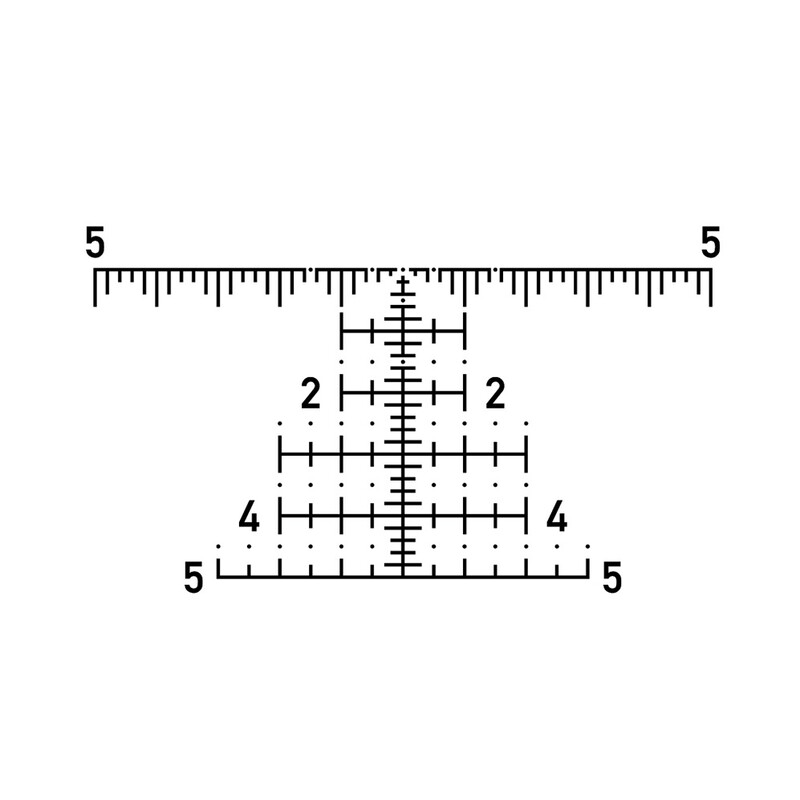 Das Fadenkreuz verfügt über ein „T-förmiges“ und „baumförmiges“ Design mit einem schwebenden Mittelpunkt, der 10,0 MRAD Seitenverstellung, 5,0 MRAD Höhenverstellung und präzise MRAD-Schritte für genaue Einstellungen und Zielauswertung bietet.
